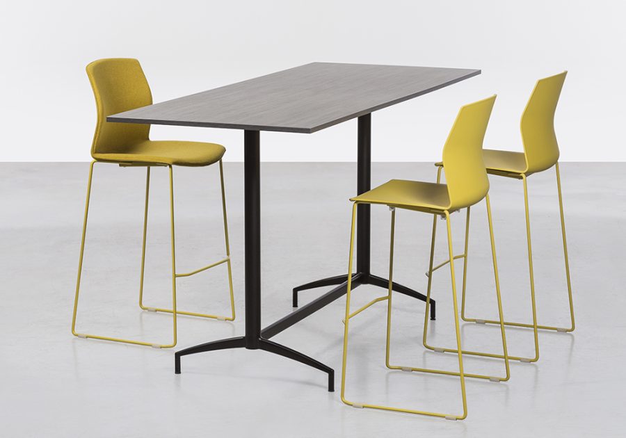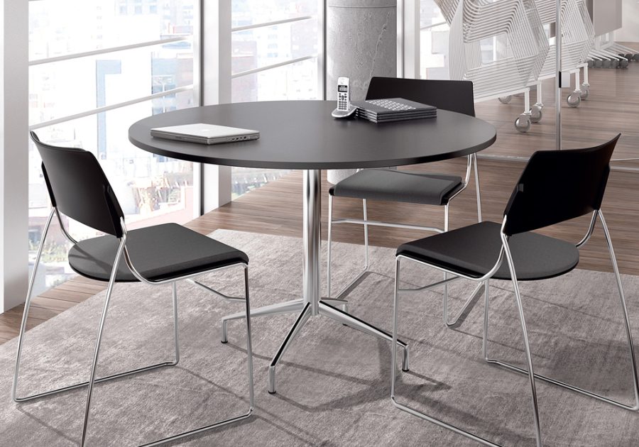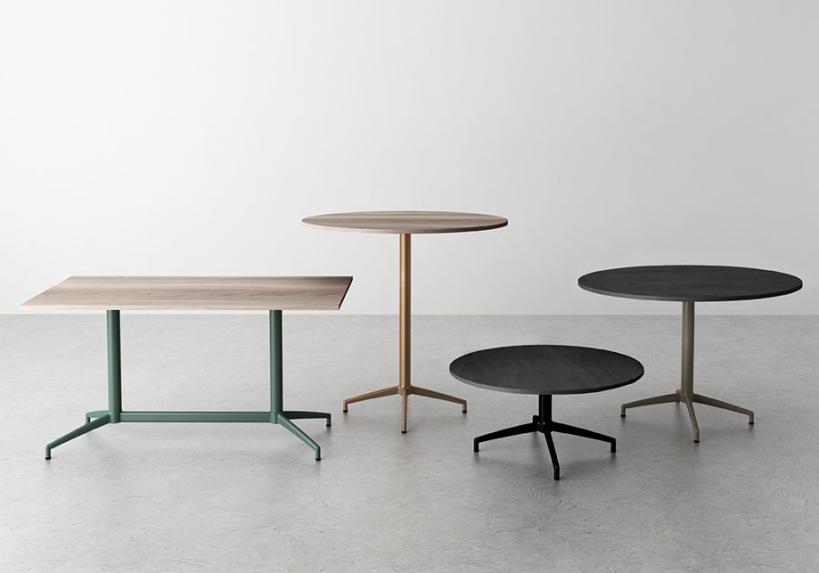 The tops, in customizable material and thickness, are supported by steel columns and a four-star aluminium base. The base has the resistance and lightness of injected aluminium, making these desks tremendously hardwearing and easy to transport.