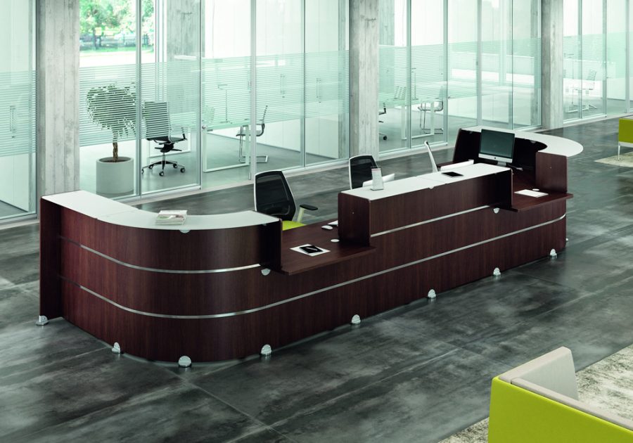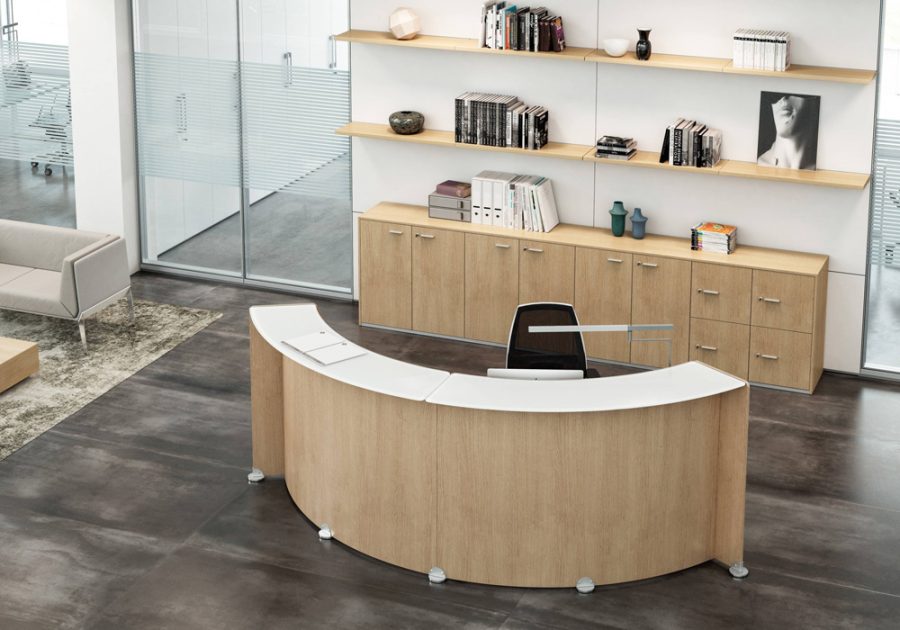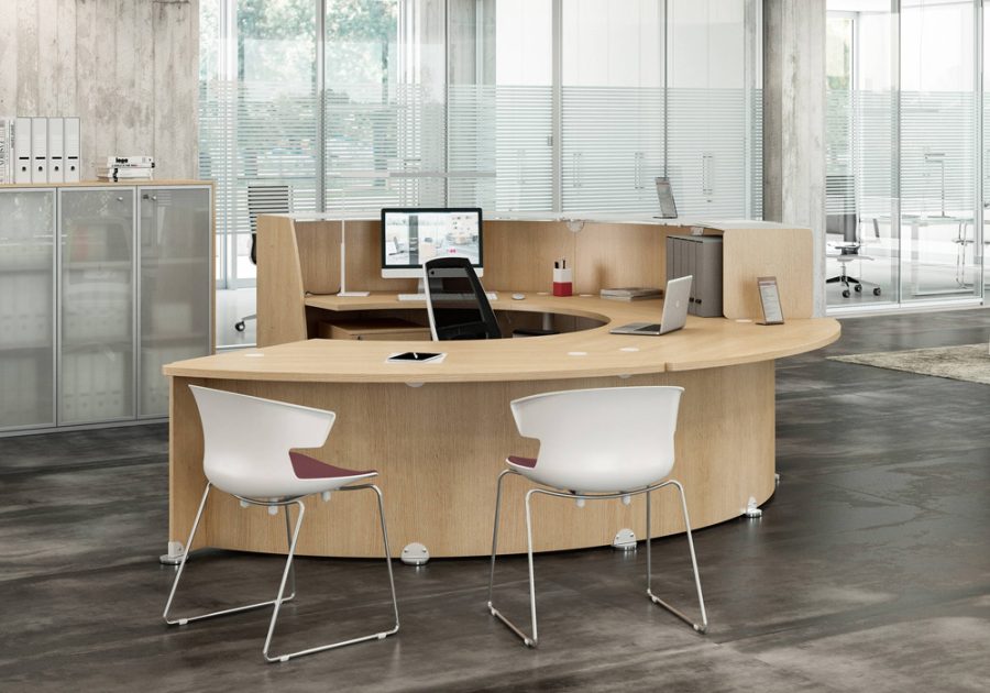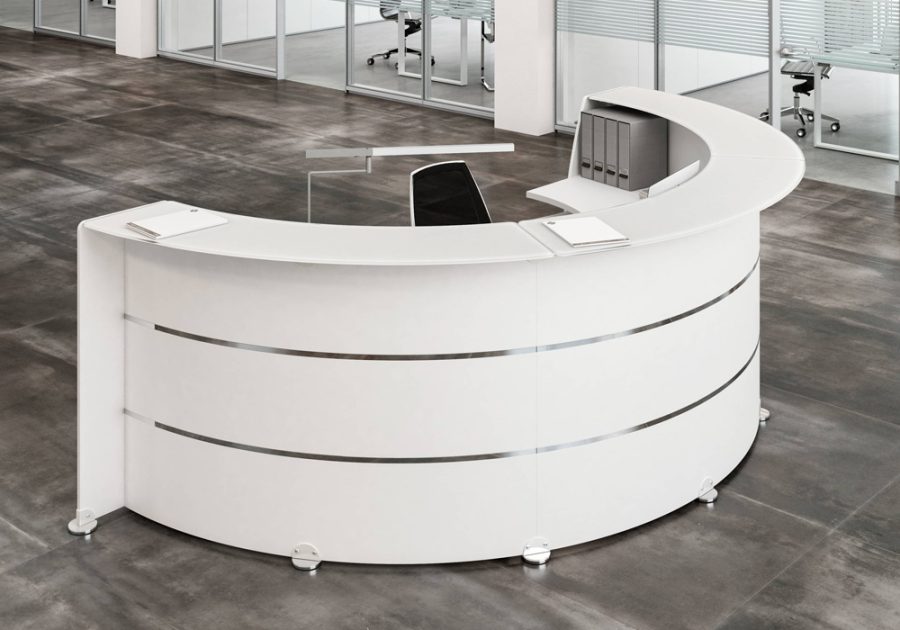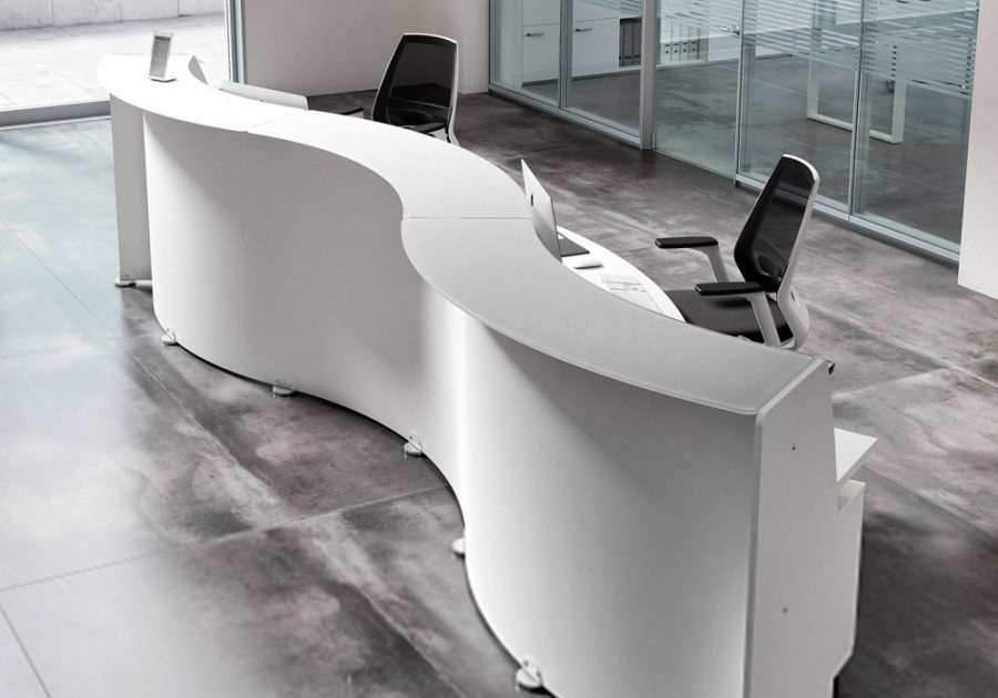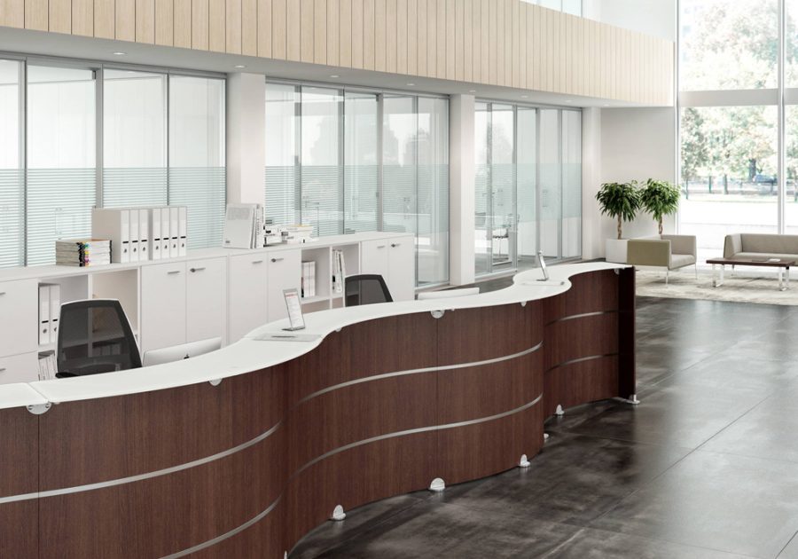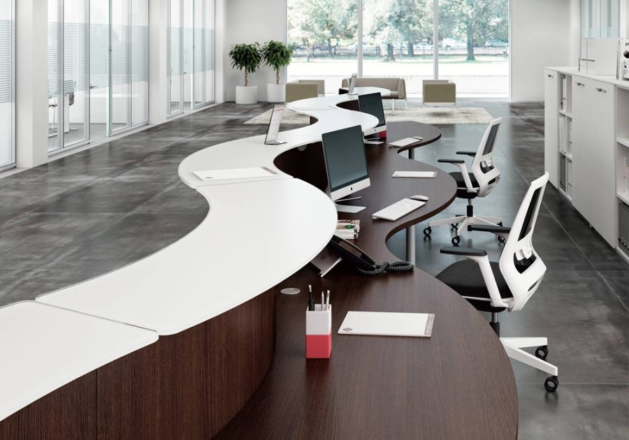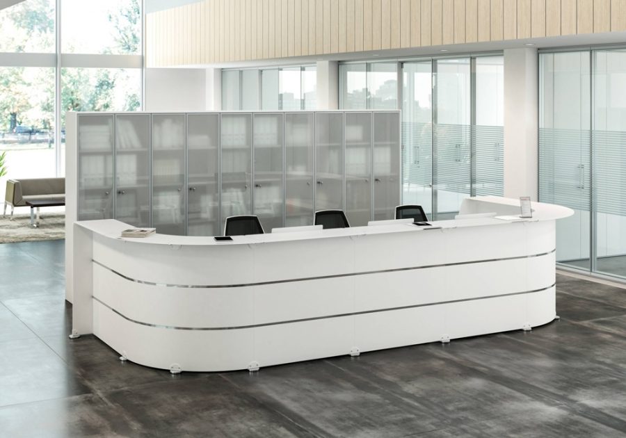 Reception Glass from Italian Quadrifoglio is the epitome of functionality: the configuration of elements can be selected according to aesthetic taste and work requirements. Soft and sinuous shapes envelop in a warm welcome and rounded lines accompany straight geometries to define reception and work areas.