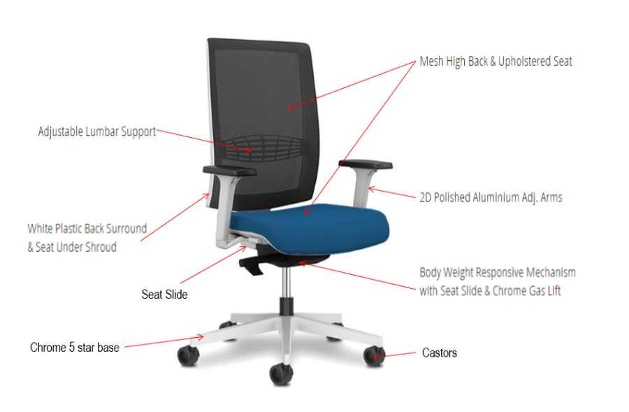 The ‘Kind Task’ office chair comes complete with a mesh back in a choice of colours and a seat pad available in a choice of premium fabrics. This stylish chair is manufactured using the highest Italian quality parts, dense long lasting seating foam, and premium quality fire safe fabrics. It’s stylish and also ergonomically conscious chair.