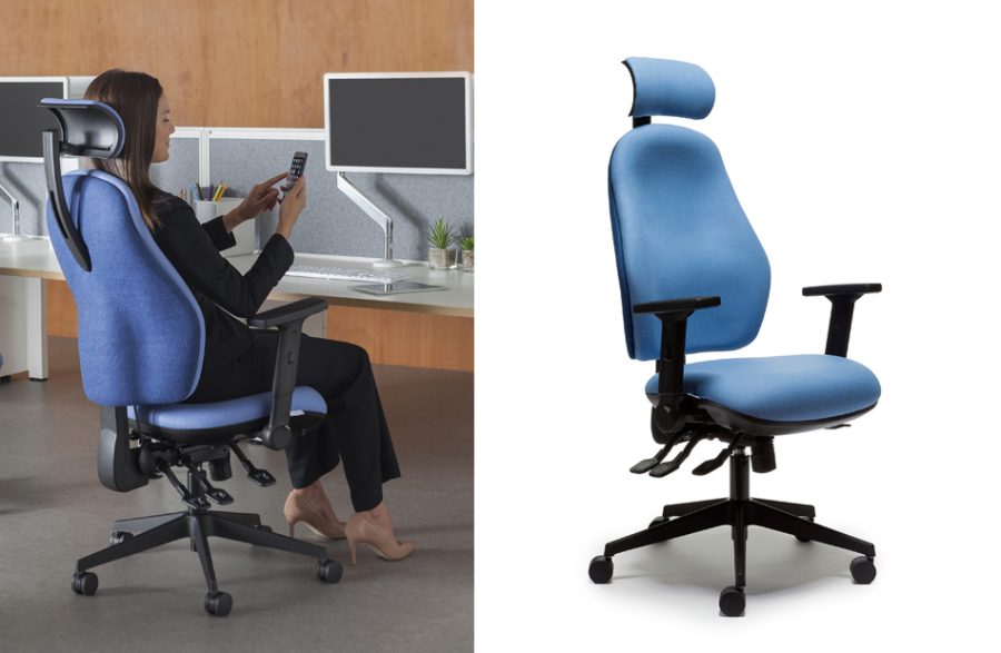 Sliding seat adapts to different thigh lengths, allows the user to optimise their own comfort and support. Inflatable Lumbar and Thorax to support the areas needed. It can be inflated or deflated as required by using a pneumatic pump. Independent movement enables the seat and backrest angle to be adjusted separately, with the ability to lock in a fixed position. Synchronised mechanism enables seat and backrest angle to be adjusted to required position. Fixed ration of 1:8:1 ensures correct ergonomic posture.