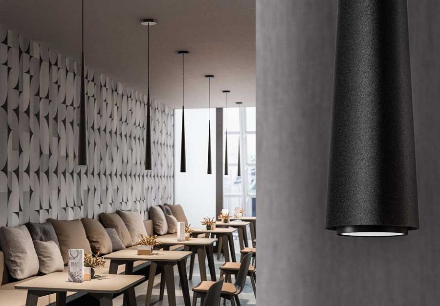 DRINK is a ceiling lamp in powder coated aluminium, which creates a convivial lighting. Drink is the perfect pendant lamp for restaurants, hotels, lounge areas and other shared spaces. The aluminium structure is orientable and adjustable according to needs, for lighting tables and seating.